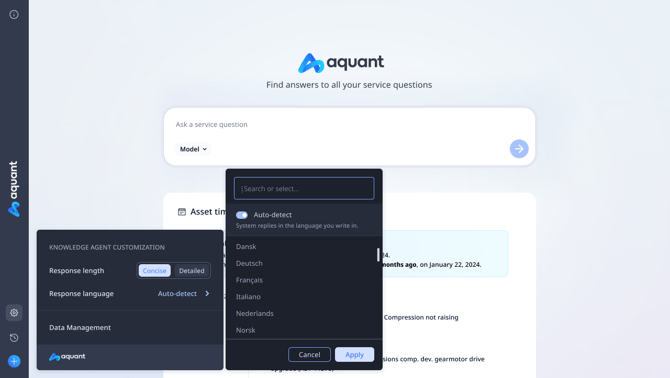 If users do not set a language preference, the system will continue working exactly as it does today using automatic language detection. However, users who want more predictable outputs can now select one or more preferred languages in the Aquant AI settings. The Knowledge Agent will then respond only in those languages, improving accuracy for multilingual teams and reducing unexpected language shifts.