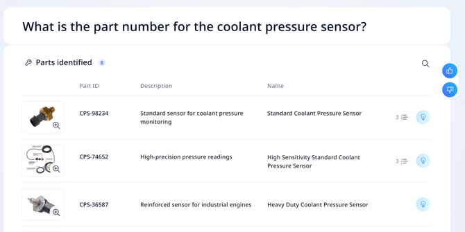 The Part Identifier helps you quickly find the right part by analyzing your question and showing relevant part info and actions; like part ID, description, and image, based on the parts catalog.